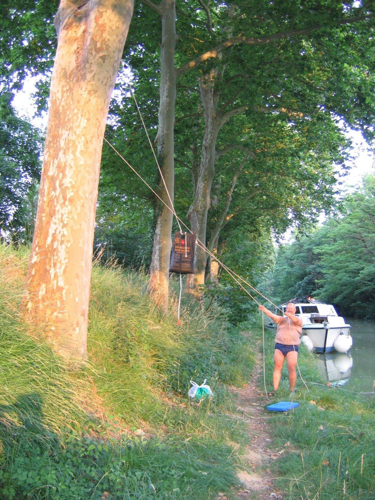 Wir hatten uns zwischenzeitlich überlegt, bis Montgiscard zu fahren und erreichten dies um 18.50 Uhr. Wir legten an und bereiteten ganz schnell unser Abendessen zu (Salat mit gegrillter Pute und Baguette), denn wir waren richtig ausgehungert. Danach wurde gespült, und Thomas installierte in einer komplizierten und raffinierten Konstruktion die Solardusche.