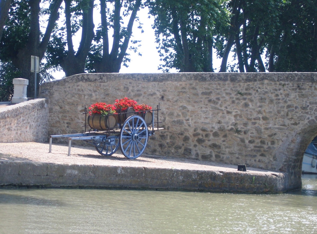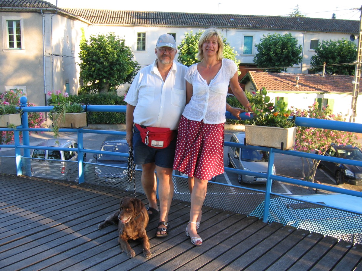Nach einer halb durchwachten Nacht (wegen Zahnschmerzen) schien heute Morgen wenigstens die Sonne wieder. Nach Waschen, Frühstücken und Spülen legten wir um 10.35 Uhr ab. Die Strecke bis Castelnaudary beträgt nur 16 km, allerdings hat man in 18 Schleusen 46 Höhenmeter zu überwinden, und das hält auf. Auf diesem Stück befanden sich die schönsten und gepflegtesten, mit vielen Blumen und Bäumen bestückten Schleusen, viele in einem Abstand von ca. 500 m. An einigen Schleusen standen Trauerweiden, die sich in dem glatten Wasser des Kanals widerspiegeln. An mehreren Schleusen hatte man hier die Möglichkeit, sich Erfrischungen oder „Produits de la Région“ zukaufen. Hier erstanden wir an einer Schleuse ein Eis und ein Glas Wein, welches wir uns schmecken ließen. Nach vielen netten Pläuschchen mit den Schleusern und Schleuserinnen erreichten wir nach Absolvierung der 4er Schleuse um 16.45 Uhr Castelnaudary, wobei Thomas in der letzten Schleuse beim Versuch, Cherrie Wasser aus dem Kanal zu holen (welches sie am liebsten säuft), den Wassernapf verlor. Den durfte ich dann am Ende der Schleusung mit dem Schleusenhaken herausfischen.