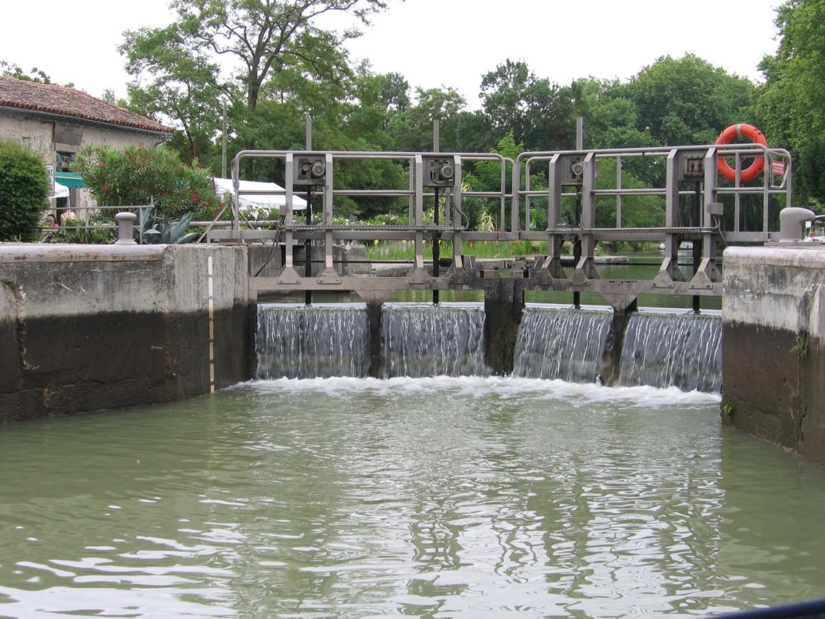 Um 10.55 Uhr brachen wir auf. Da wir nur ein kurzes Stück (bis zur Schleuse Négra) fahren wollten, ließen wir es ruhig angehen. In den letzten zwei Tagen waren wir immer alleine in den Schleusen gewesen, daher waren wir um so überraschter, heute wieder mit einem Mietboot zusammen zu schleusen. Als wir zur zweiten Schleuse kamen„ stand“ dort ein Segelboot mitten im Kanal vor der Schleuse, und der Kapitän deutete uns mit Händen an, dass wir hinter ihm warten sollten, da die Schleuse noch nicht frei war. Da wir aber nicht so „im Freien“ warten wollten, fuhren wir langsam an dem älteren Mann vorbei und legten vor ihm am Ufer an. Das Mietboot hinter uns hatte auch Probleme, sich in der Mitte des Kanals zu halten und legte ebenfalls an. Als die Schleuse endlich frei war, ließen wir die beiden Boote zuerst einfahren und legten uns hinter das Segelboot. Der ältere Mann war alleine auf seinem Boot und mußte beim „Festmachen“ vom Boot herunter, die Tampen um die Poller legen und wieder zurück aufs Boot. Ebenso beim Wiederablegen. Daraufhin beschloss ich, dem Mann beim „An- und Ablegen“ in der nächsten Schleuse zu helfen und erfuhr dabei, dass er Engländer war, mit dem Boot auf den Weg zurück nach Hause und seine Frau gestern mit dem Flugzeug zurückgeflogen war. Er war wider Erwarten total nett und bedankte sich nach jeder Schleuse mehrmals für die Hilfe.