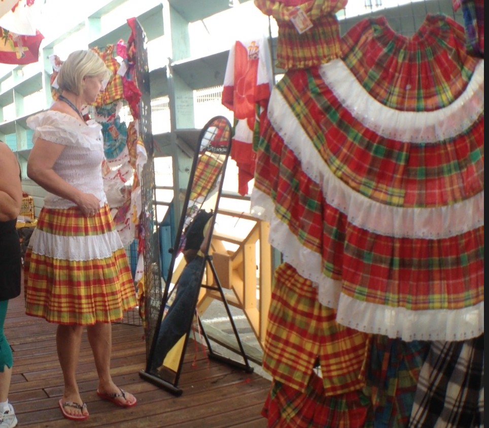 Als wir heute Morgen gegen 7 Uhr aufwachten, liefen wir langsam in den Hafen ein, und es wurde wieder auf unserer Seite angelegt. Es war schon richtig heiß. Nachdem wir angelegt hatten, zogen wir uns an und gingen zum Frühstücken. Heute wurden wir zwei Tische weiter platziert und saßen einem älteren Ehepaar aus Schweden gegenüber. Da wir für heute nichts gebucht hatten, hatten wir endlos Zeit und so schlenderten wir zuerst zum Guestservice, fragten, ob unsere Trinkgelder eigentlich schon bezahlt seien, weil wir das auf unserer Abrechnung im Fernseher nicht sehen konnten, aber wir hatten sie ja schon von zu Hause aus bezahlt. Man bestätigte uns die Zahlung. Danach buchten wir für morgen auf Barbados eine Schnorcheltour mit Schildkröten und begaben uns zur Fotoabteilung. Wir fragten nach, wie das denn mit der Abnahme der Fotos für die zwei Reisen sei; wir würde jetzt für 249 $ alle Fotos von den zwei Kreuzfahrten in Form von Abzügen bekommen, müssten uns diese aber selber zusammensuchen. Damit begannen wir dann schon mal, und Thomas bezahlte die 249 $. Jetzt konnten wir jedes Mal, wenn wir Zeit hatten, die Fotos zusammensuchen und an der Kasse bei einem Mitarbeiter abgeben, sie würden dann für uns gesammelt. Ab jetzt würden wir jede Gelegenheit nutzen, uns fotografieren zu lassen. Anschließend gingen wir in die Kabine, um unsere Sachen für einen Strandtag zu packen, und um kurz vor 10 Uhr verließen wir das Schiff. Direkt im Hafen waren unter Pavillons Verkaufsstände aufgebaut, und dort erstand ich für 48 € (wir befanden uns ja in Frankreich und konnten mit Euro bezahlen) eine schicke weiße Bluse.
